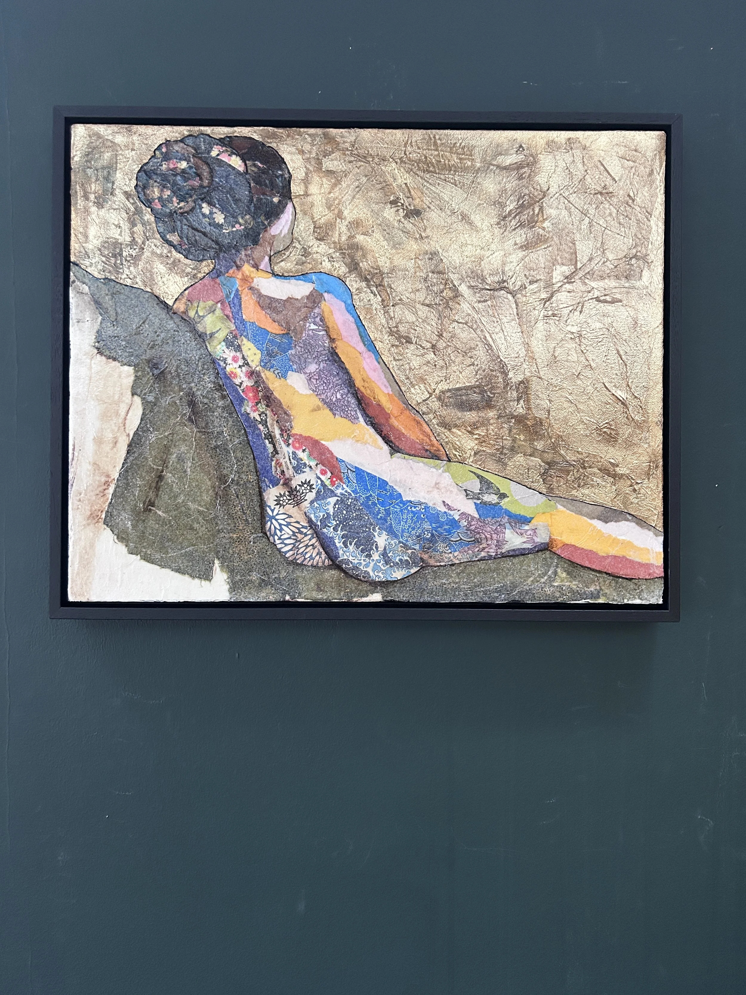 A seated figure, collaged from life then embellished with metal leaf and varnish.