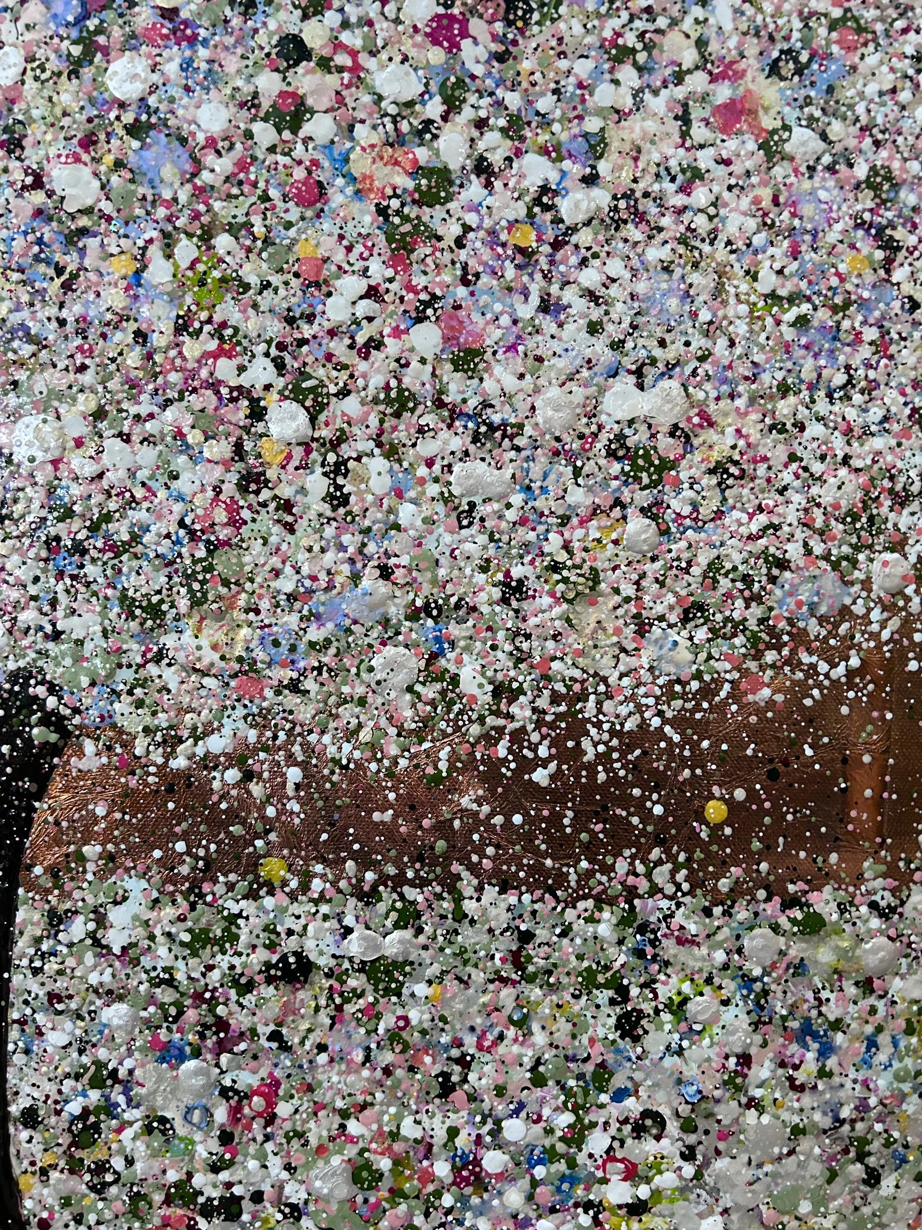 Abstract blue blossom painting in shades of blue and green, with flashes of metal leaf.