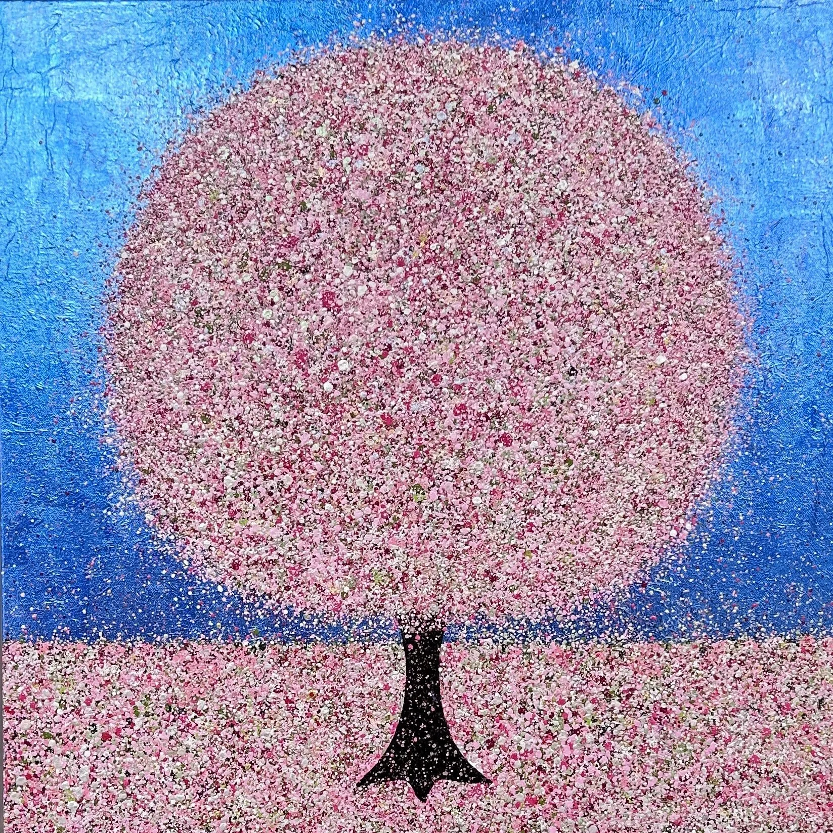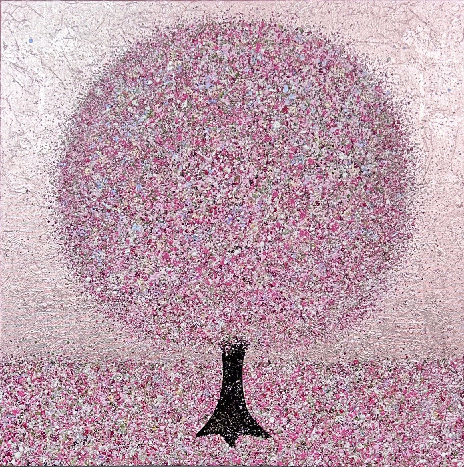 A truly happy cherry blossom tree, in shades of pink, red, white and green and hints of, magenta, peach and shimmering pastel tinted whites against a metallic pale pink background.