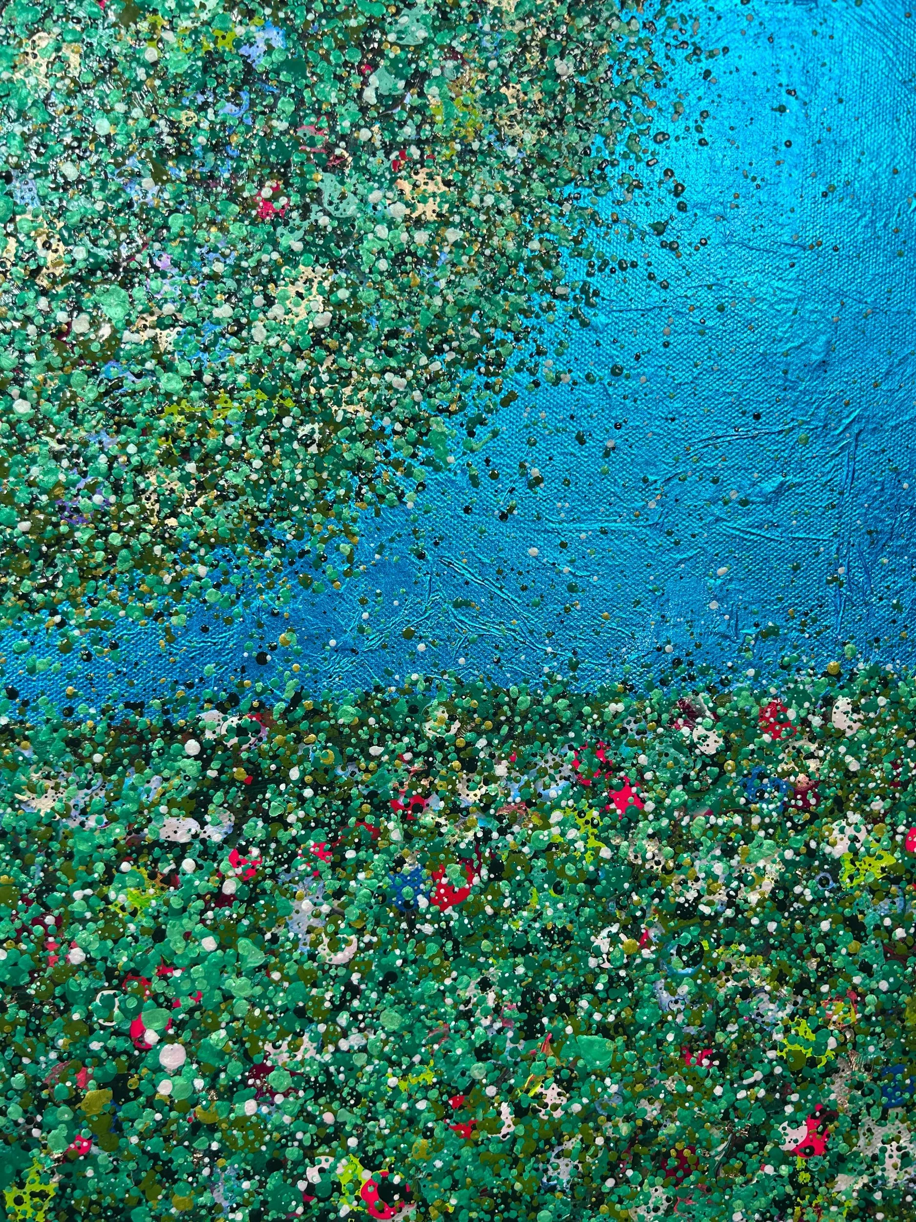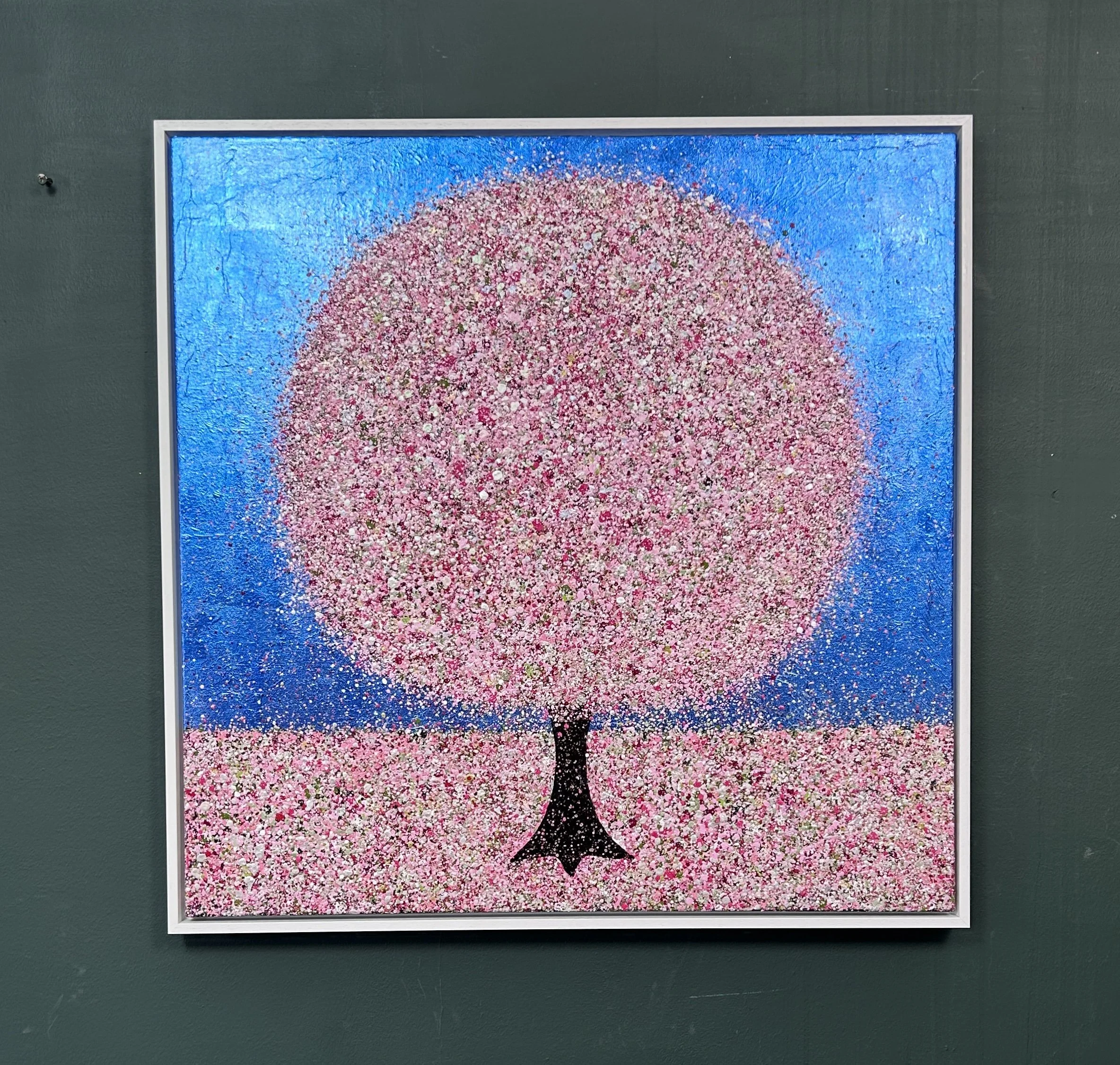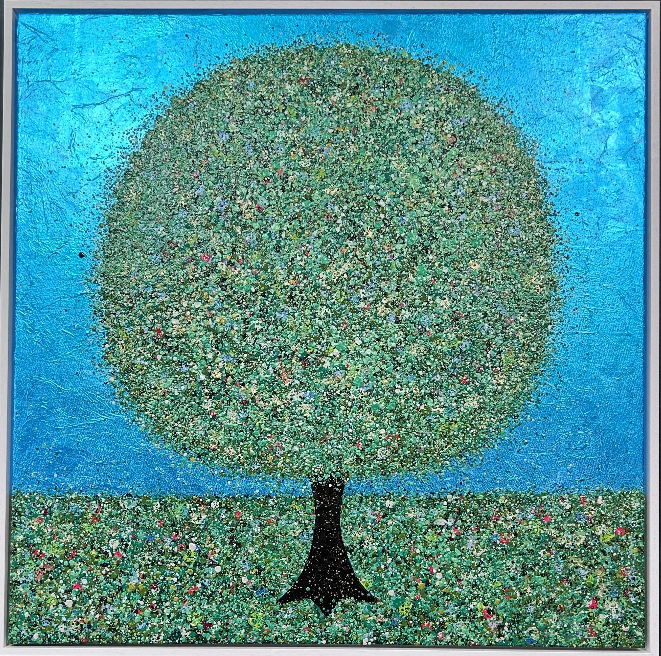 The canvas measures 76x76cm, the painting continues around all the edges, and it is framed in white, total size 80x80cm