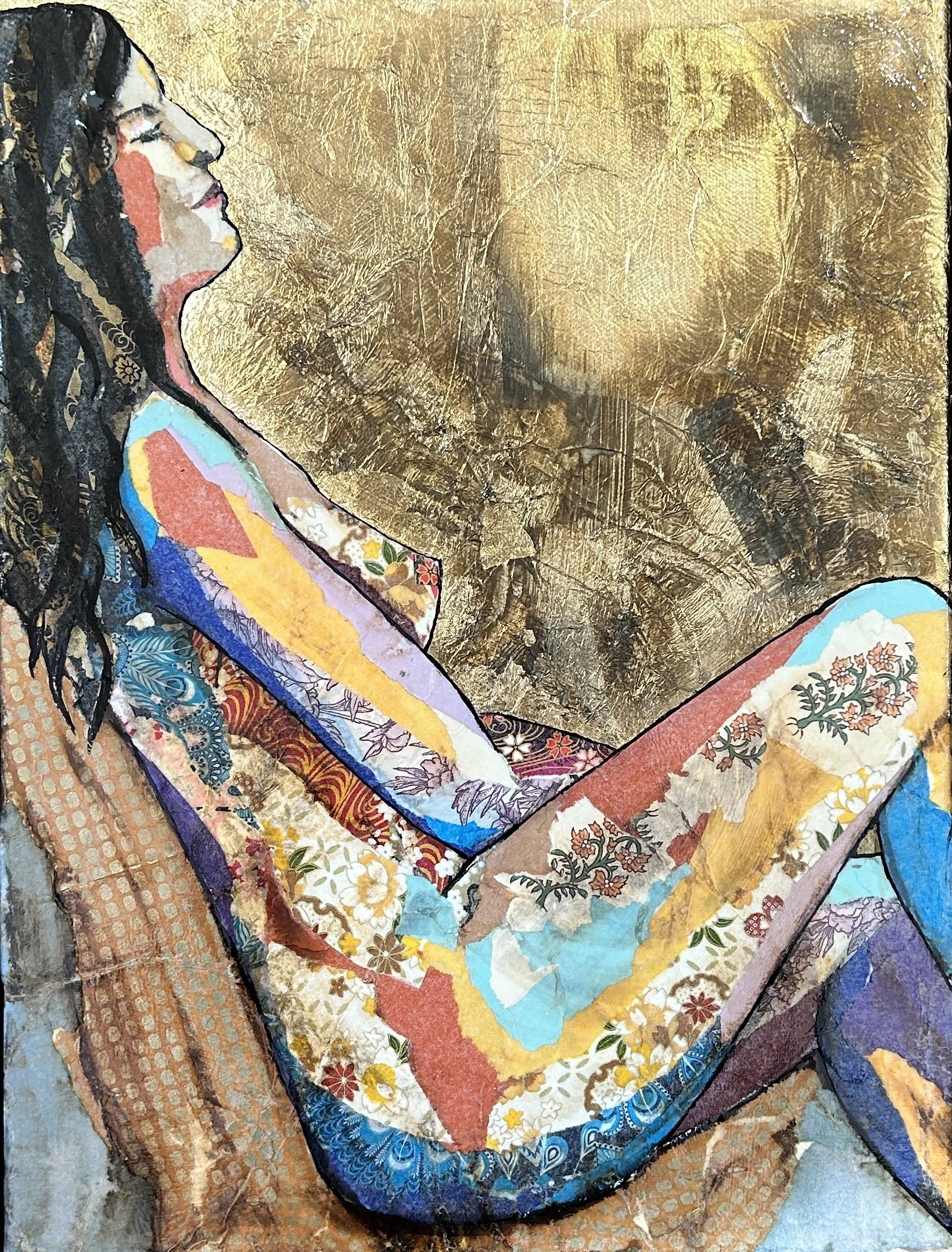 An original life drawing, collage and acrylic on canvas, framed in black, 84×84cm including frame